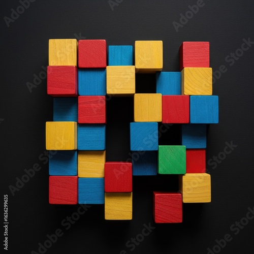 block, wooden, colourful, vibrant, square, pattern, grid, irregular, design, construction, arrangement, composition, geometric, childlike, playful, abstract, visual, art, education, learning, creative, puzzle, building, texture, red, blue, yellow, green, primary, colours, surface, top, view, still, life, display, object, form, order, shape, structure