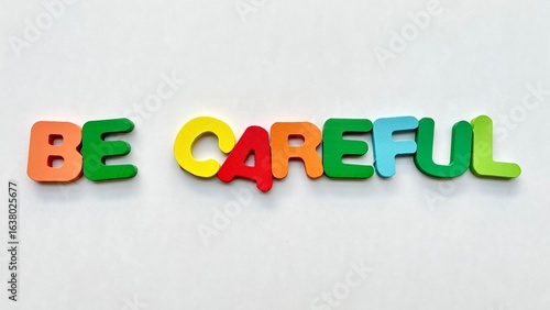Colorful wooden letters spelling out "BE CAREFUL" on a white background.