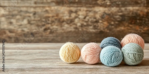 Colorful wool balls in pastel hues of yellow, pink, blue, and green arranged in a cluster on a rustic wooden table against a textured backdrop.
