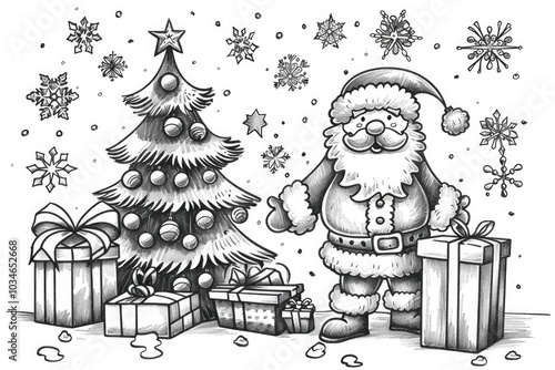 Coloring book illustration of a hand drawn Santa Claus alongside a Christmas tree and gift boxes showcasing a winter theme