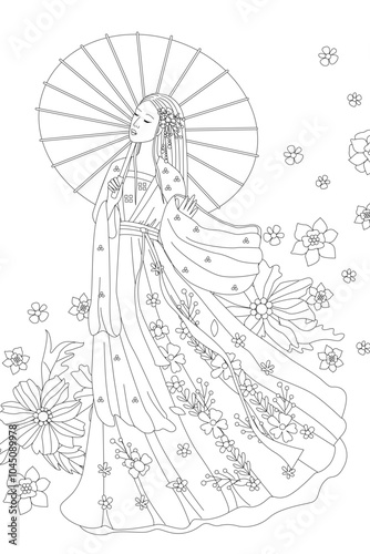 coloring book page for adults and children. beautiful oriental woman holding umbrella dressed in traditional costume