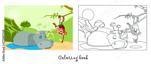 coloring illustration for kids. caricature hippopotamus and monkey