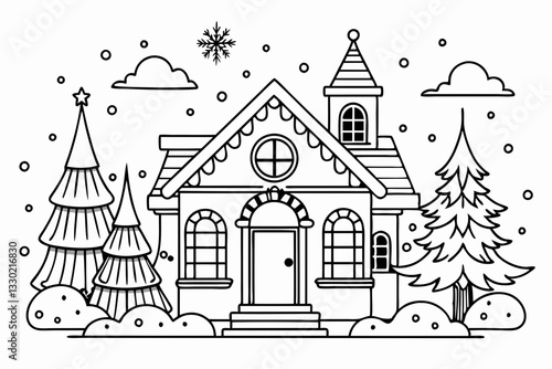 vector, illustration, christmas, drawing, winter, art, vignetting, home, white, outline, line, holiday, black, graphic, tree, house, book, page, colouring, decoration, doodle, building, colouring, design, celebration, new, background, adult, year, festive, sweet, cartoon, hand-drawn, chocolate, gingerbread, snow, colours, december, food, candy, dessert, vintage, detailed, christmas tree, interior, black-and-white, cake