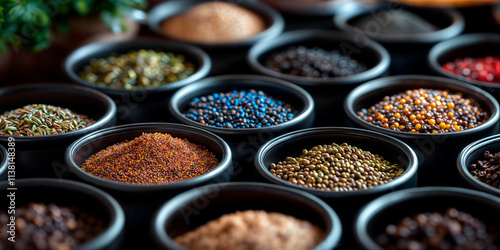 Colourful collection of dried spices in small pots used for cooking and flavour