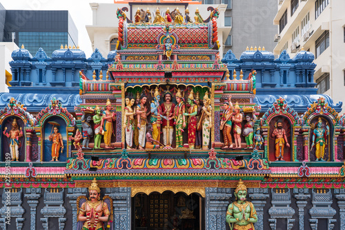 Colourful statues of Hindu religious deities adorning the entrance of a Hindu temple in Singapore