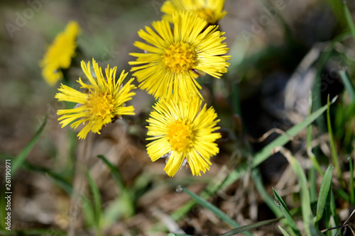 Coltsfoot flowers (Tussilago Farfara) in spring forest on a sunny day