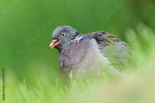 Columba palumbus aka Common Wood Pigeon. Close-up portrait. Bird probably attacked by Trichomonosis. Bird feeder disease. Deformed beak.