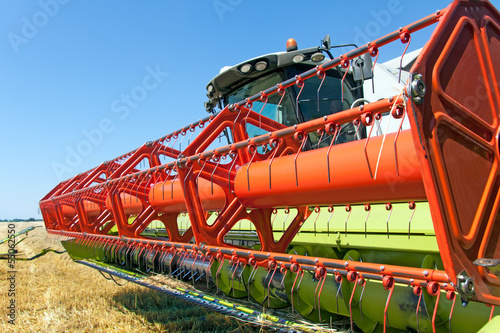 Combine harvests wheat on a field in sunny summer day