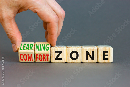 Comfort or learning zone symbol. Concept words Comfort zone Learning zone on wooden cubes. Beautiful grey background. Psychologist hand. Business and comfort or learning zone concept. Copy space.