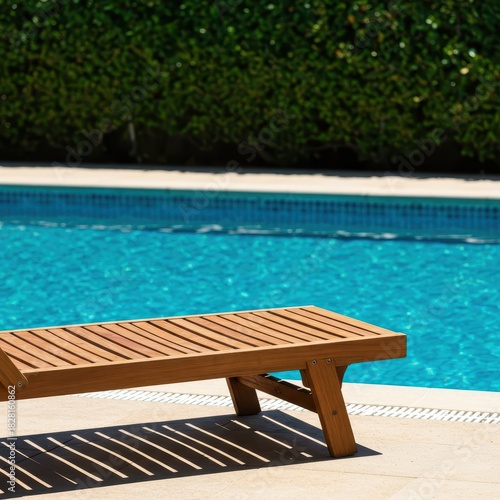 Comfortable wooden sunbed positioned by the clear blue swimming pool, awaiting a hot summer afternoon of tanning and luxurious leisure, tranquil, resort, outdoor