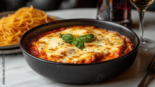 comforting, bowl, parmigiana, pasta, cheese, italian, cookery, meal, dining, eatery, epicure, food, dish, plate, basil, sauce, tomatoes, layer, baked, utensil, spaghetti, beverage, glasses, dinner, savoury, delicious, appetising, homemade, fresh, ingredient, nourishment, warm, serve, presentation, feast, culinary, traditional, receipe, favor, enjoy, wholesome
