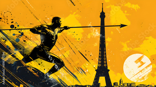 olympic, 2024, paris, olympic games, javelin, comic book, illustration, eiffel tower, yellow background, athlete, sport, competition, france, graphic art, stylised, dynamic, action, motion, vibrant, iconic, parisian, vector, poster, energetic, athleticism, famous landmark, graphic design, cartoon, creative, artistic, energy