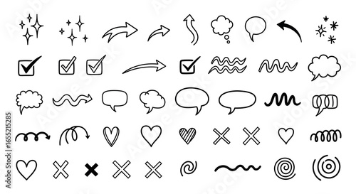 Comic boom cartoon effect line element set. Comic speech bubble pow, boom text, explosive splash smoke, wow cartoon vector icon. Hand drawn sketch doodle explosive element. Vector illustration.