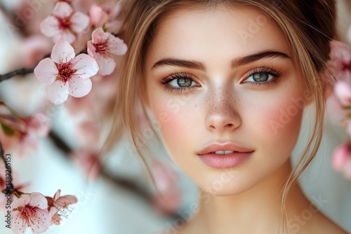 Commercial ad campaign conceptual art. Spring mood, dark night and warm mystic light - complementary lighting. Pretty caucasian young woman surrounded by cherry blossoms.