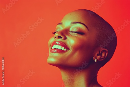 Commercial ad graphic layout. Gorgeous happy black girl - for ads, print ad ad and online promotion banner use. Short coiffure - bald head - no hair. Modern black girl concept. Black model.