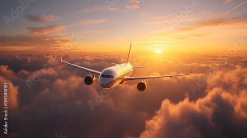 Commercial airliner flies above thick clouds during a dramatic golden sunset