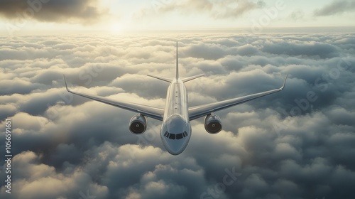 Commercial airplane soaring above clouds symbolizing quick travel for vacations and business