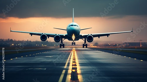 Commercial airplane taking off from the airport runway with passengers, travel concept