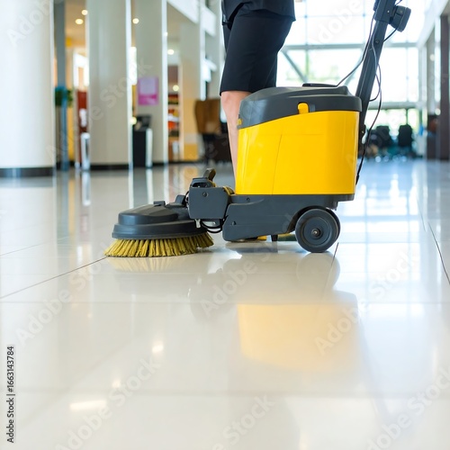 cleaning, floor, machine, yellow, black, tile, commercial, building, person, modern, maintenance, scrubbing, equipment, clean, shiny, bright, professional, industrial, work, detail, service, care