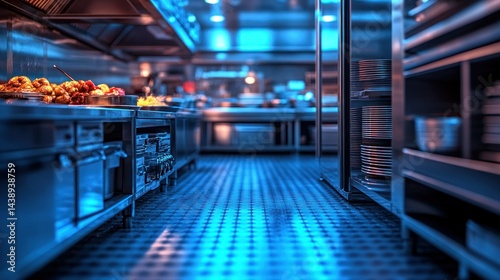 kitchen, commercial, eatery, food, tied-up, professional, cooking, equipment, stainless steel, chef, hospitality, industry, modern, design, interior design, food preparation, oven, stove, light, blue, toned, background, blurred, interior, illuminated, clean, efficient