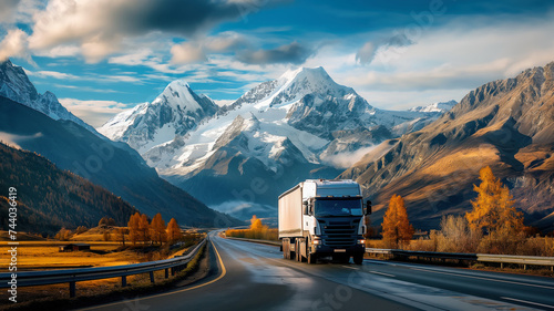 Commercial semi-truck driving on a highway with majestic snow-capped mountains and autumn trees in the background