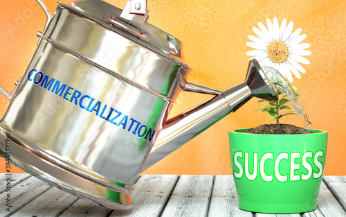 Commercialization helps achieve success - pictured as word Commercialization on a watering can to show that it makes success to grow and it is essential for profit in life, 3d illustration