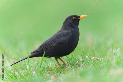 Common Blackbird (Turdus merula) male standing on grass in natural environment – common bird species in the Czech Republic