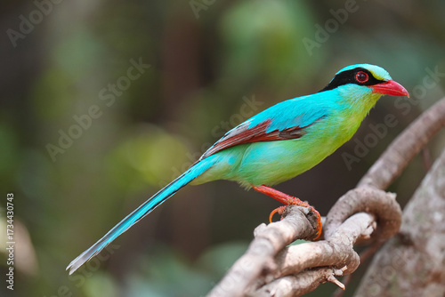 Common Green Magpie (Cissa chinensis) bird perching on branch. Bird watching in natural habitats in the forest.