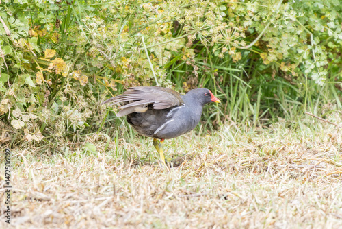 Common moorhen walking on dry grass near green foliage