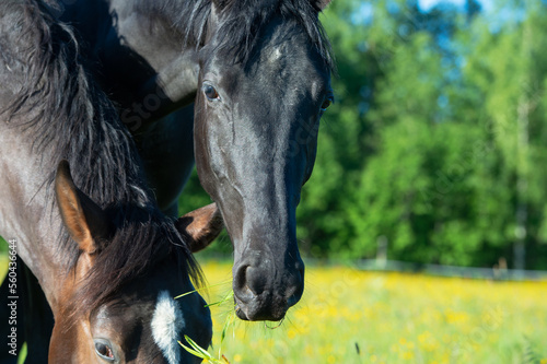 head, horse, sunny, summer, relation, equine, outside, card, portrait, high, beauty, equestrian, beautiful, inquisitive, domestic, space, wild, together, animal, nose, sportive, herd, freedom, meadow, pasture, liberty, closeup, face, friends
