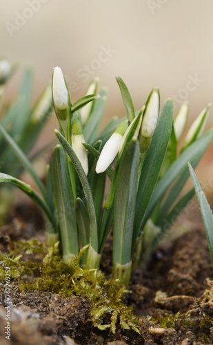 Common snowdrop just before blooming, early spring flower on bokeh background, snowdrops in buds, selective focus,
