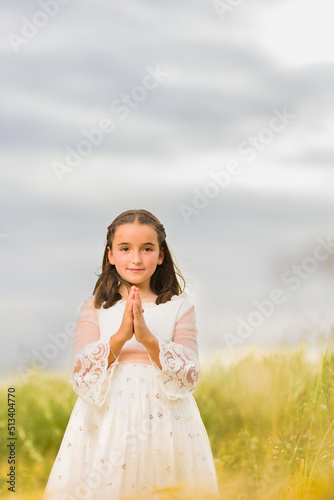 communion girl. catholic religion child celebration hispanic female portrait. summer and spring