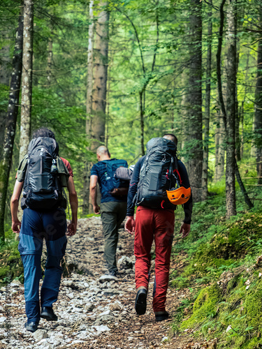 Company of three trekking hikers mountain climbers seen from the back walking through the forest with backpacks climbing helmets equipment