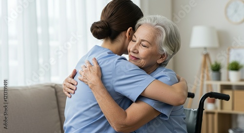 nurse, elderly, patient, hugs, compassion, care, health care, senior, woman, wheelchair, living room, modern, bright, cosy, connection, support, medicals, caregiver, assistance, empathy