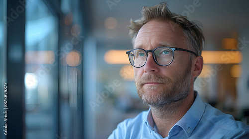 Competitive Analysis: A market analyst in a corporate office, evaluating competitors with selective focus to highlight critical data, and a bokeh effect to soften the background