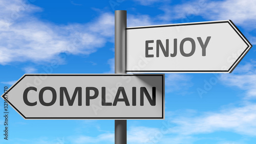 Complain and enjoy as a choice - pictured as words Complain, enjoy on road signs to show that when a person makes decision he can choose either Complain or enjoy as an option, 3d illustration