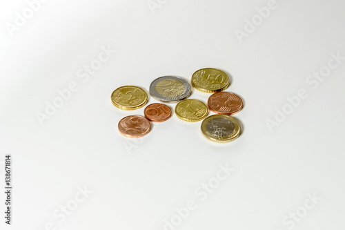 complete set of euro coins, contains 1, 2, 5, 10, 20, 50 cent and 1, 2 euro, isolated on white background