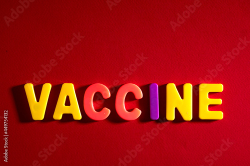Completing vaccine words. Vaccine word made from colourful plastic baby development blocks. Red background