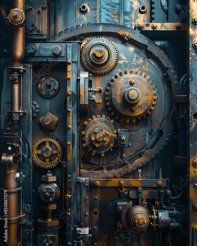 complex, dark, metal, vault, mechanism, various, gear, lever, bolt, highly, detail, machine, hardware, setup, sprocket, design, pattern, cogwheel, device, intricate, style, workshop, retro, weather