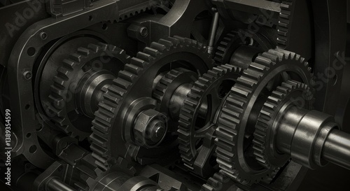 Complex Gear System Mechanics - Detailed close-up of intricate metal gears, showcasing the precision and complexity of machinery. Perfect for industrial, engineering, or technology concepts