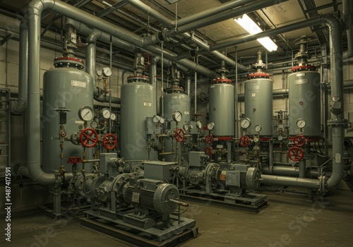 pipe, pump, pressure, vessel, industrial, machinery, system, engineering, facility, metal, grey, complex, network, component, concrete, wall, floor, gauge, technology, power, energy, infrastructure, maintenance, functionality, moody, dark, atmosphere, mechanic, plumbing, intense, intricate, control, regulation, pipeline, technical, installation, underground