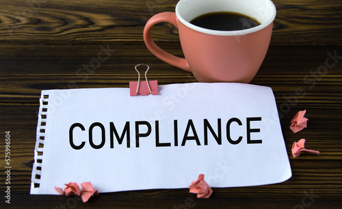 COMPLIANCE - word on a white sheet on a wooden brown background with a cup of coffee and a pen