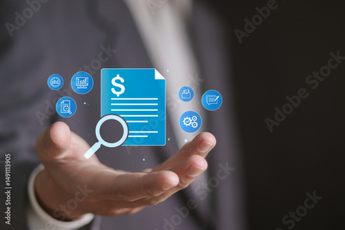 Compliance verification financial statements, regulatory requirements, gathering recommendations, audit and risk assessment. Businessman analyzes financial data and internal control.