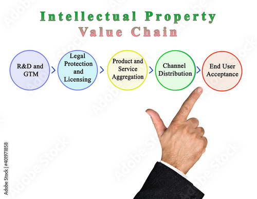 intellectual, property, value, chain, research, development, legal, protection, law, product, service, aggregation, grooved, distribution, end, user, acceptance, process, diagram, concept, business, commerce, logistic, consumer, application, man, male, person, finger, pointing, virtual, screen, manager, lawyer, inventor, hand