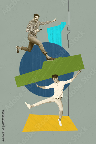 Composite artwork collage template sketch of two man dance run hand hold smartphone finger point manager employment human resources job