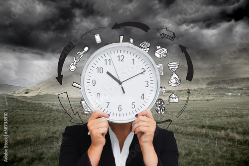 Composite image of businesswoman in suit holding a clock
