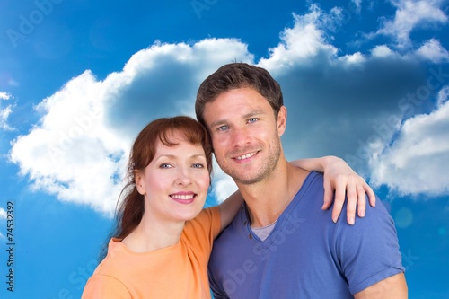 man, male, caucasian, woman, female, blue, sky, sunlight, cloud, cloudy, white, sunshine, sun, digital, computer graphic, lifestyle, leisure, standing, beautiful, pretty, attractive, couple, human relationships, together, affection, partiality, closeness, love, lover, affectionate, smiling, happy, romance, romantic, casual attire, portrait, cheerful, photogenic, embracing, hugging