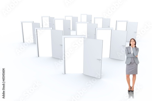 young adult, woman, female, caucasian, door, doorway, opportunity, open, light, bright, digital, computer graphic, businesswoman, well-dressed, stylish, pretty, attractive, beautiful, brown hair, brunette, career, professional, business, corporate, thinking, thoughtful, hand, serious, focused, concentrating, frowning, looking up