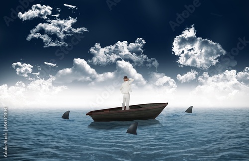 mature adult, woman, female, caucasian, digital, computer graphic, shore, coastline, sea, ocean, environment, tide, wave, water, weather, nature, boat, vessel, sailboat, regatta, transport, transportation, wood, wooden, shark, circling, danger, risk, dark, cloudy, cloud, well-dressed, stylish, attractive, career, professional, business, corporate, businesswoman, pretty, thinking, thoughtful, considering