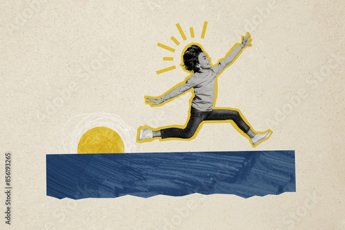 Composite photo collage of happy teenager boy run summer vacation ocean water sunny weather holidays relax isolated on painted background